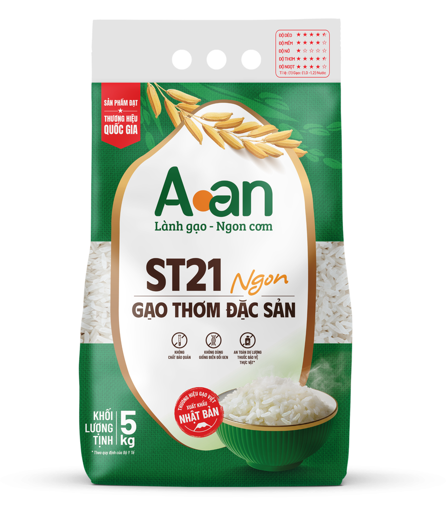 Gạo đặc sản Sóc Trăng ST21 được thu hoạch từ giống lúa ST21 tự nhiên. Gạo của thương hiệu Aan được sản xuất trên dây chuyền hiện đại, cam kết không đấu trộn, không chất tạo mùi, mang lại sản phẩm gạo chất lượng, an toàn cho sức khoẻ người dùng.